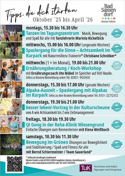 <p>Mit unserem wöchentlichen Gesundprogramm bleiben Sie in Bewegung: Tanzen, Qi Gong, Bewegung im grünen, Achtsamkeitsspaziergänge und eine Alpaka-Auszeit. Außerdem laden wir regelmäßig zu spannenden Führungen durch den Ort und Kurpark ein.</p>